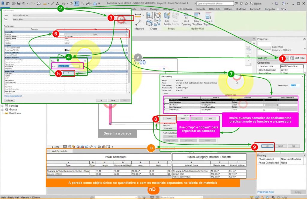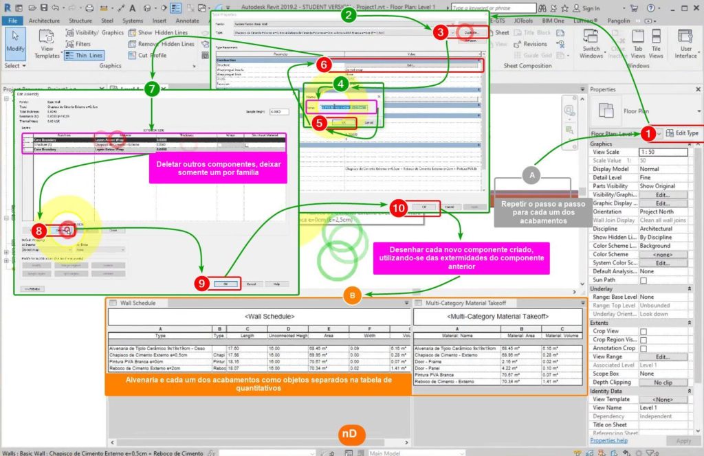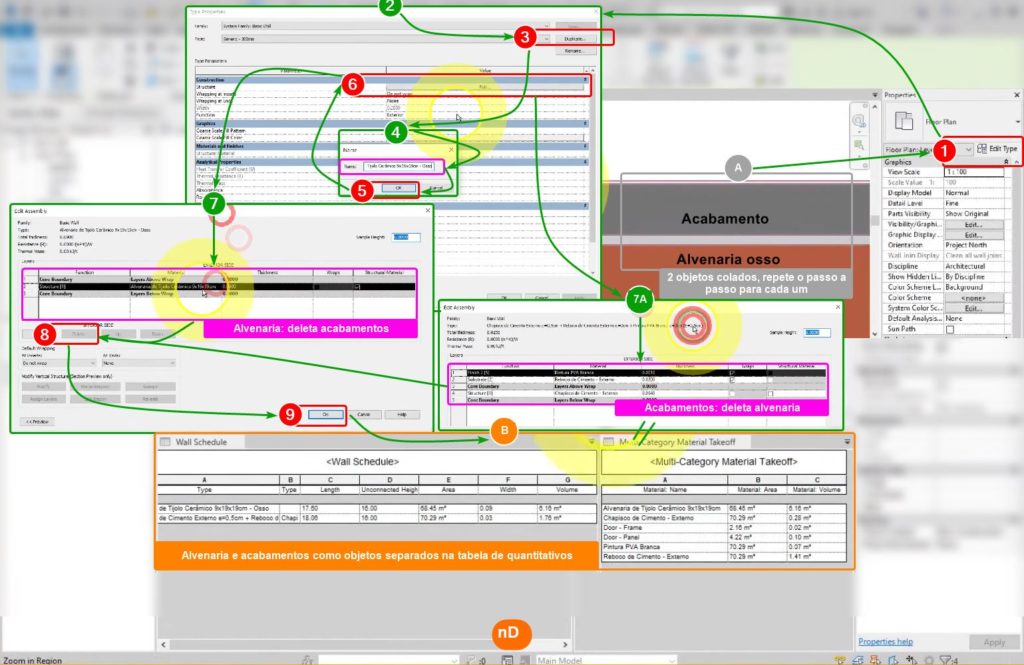 Nesse método, cria-se um objeto parede com todos os seus componentes inclusos, isto é, seu material em osso e seus materiais de acabamentos. Com todos os componentes da parede juntos, a tabela de quantitativos apresentará somente um item (um objeto) parede com todas as categorias selecionadas (tipo, altura, etc). Já a tabela de materiais irá descrever as categorias para cada material que a compõe.