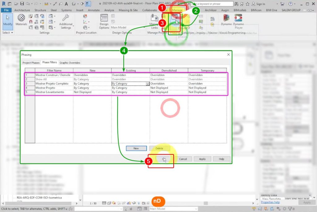 O comando “Phases” pode ser acessado pela aba “Manage” no painel “Phasing“. É dividido em 3 abas: o “Project phases” que são as fases de construção existentes no seu projeto; “Phase Filters” que é o que você escolhe mostrar ou não na sua vista (os filtros para cada fase de projeto); e o “Graphic Overrides” no qual você configura a representação de cada fase.