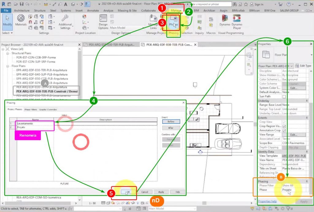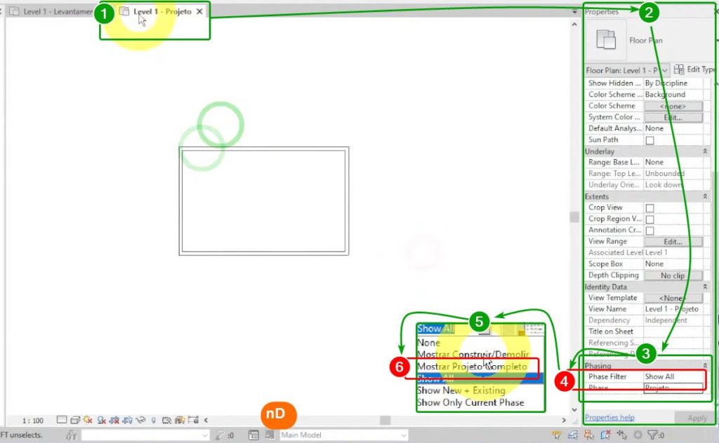 Depois que você configurar todas as fases, no último campo da aba “Properties“, você encontrará o “Phasing“. Em “Phase” você pode alterar a fase de projeto e tudo que você desenhar a partir disso, pertencerá a essa fase.